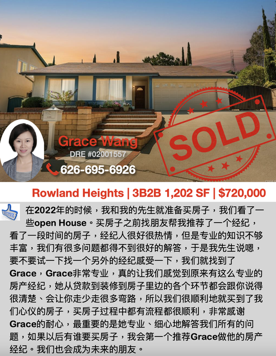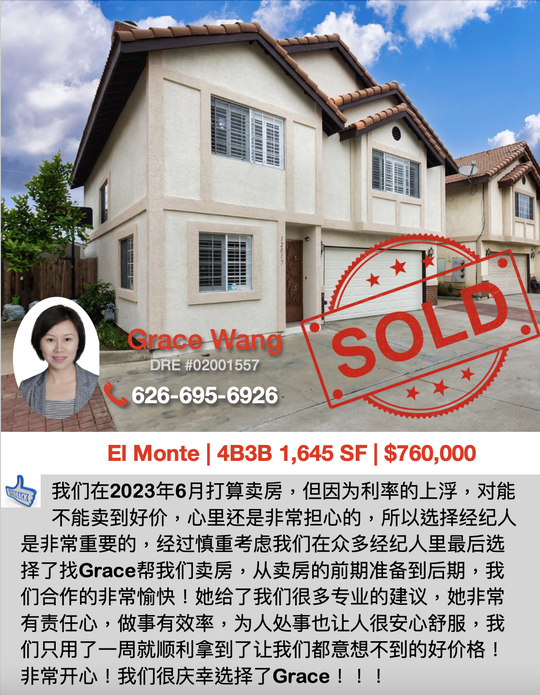 熟悉市场,专精卖房买房,经验丰富,优质服务,请联系Grace 626. 695. 6926;