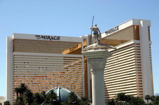 金殿大酒店(Mirage Hotel) 坐落在新大街的中心区域,共有3044间客房,279 间豪华房间及12家餐厅。门口以流泉飞瀑的布置闻名。入夜,淙淙流水中,还可看到人工火山爆发的奇景。酒店中还饲养着两头珍贵的白老虎,供客人免费观赏。梦幻金殿大酒店拥有号称拉斯维加斯最酷的饭店大厅,大厅里面是流水淙淙,到处是棕榈、兰花装饰的热带风情,在拉斯韦加斯干燥酷热的沙漠气候中,游客一踏进饭店大门,进入眼帘的竟是一遍茂密的热带丛林,除让人大吃一惊外,更是暑气全消。